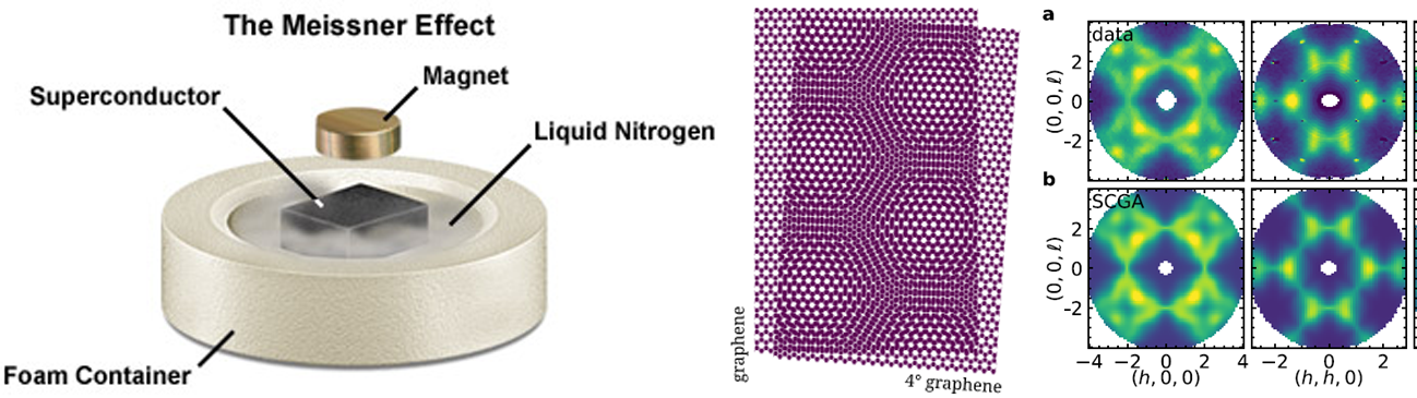 Superconductivity is associated with magnetic flux expulsion, which in turn causes magnetic levitation in the above demonstration (see video). J. Robert Schrieffer was the co-recipient of the Nobel Prize for developing the BCS theory of superconductivity. Three decades ago, defying many expectations, new forms of quantum matter were discovered including unconventional superconductors and quantum Hall states. We now understand that just like a large collection of atoms can organize itself into solid, liquid or gas phase, quantum matter can organize itself into "valence bond solid", "spin liquid" and "Fermi gas" phases among many others. The quest to understand such phases and the conditions under which they occur has spawned the study of correlated systems. These include, but are not restricted to, moire systems (e.g. "twisted graphene"), quantum magnets, quantum Hall states, topological matter, metal-insulator transitions and more.
